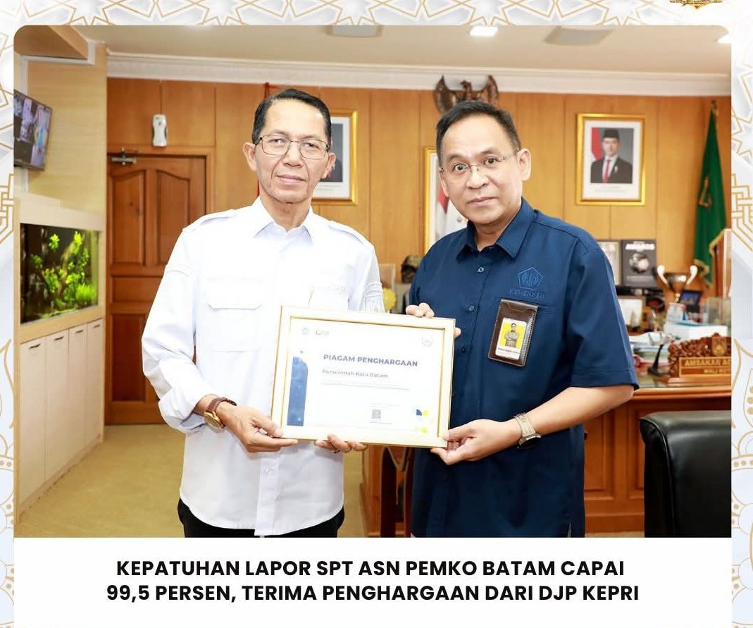 Penghargaan tersebut diberikan setelah tingkat kepatuhan pelaporan SPT Tahunan Orang Pribadi Tahun Pajak 2025 oleh pegawai di lingkungan Pemko Batam mencapai 99,5 persen.
